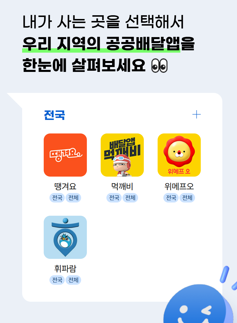 다양한 지역 기반의 공공배달앱에서 본 사업에 참여하고 있습니다. 사용자가 거주하는 지역에 따라 다음의 공공배달앱들 중 하나를 이용할 수 있습니다.