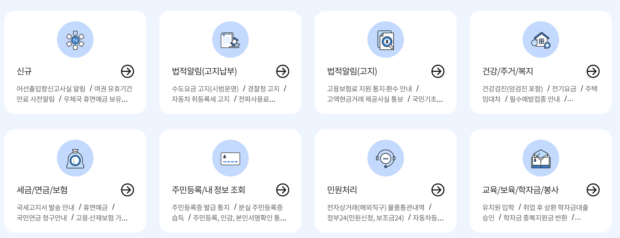 각종 행정기관 웹사이트를 일일이 방문하거나 민원안내 전화를 이용하지 않아도 필요한 정보를 받을 수 있어 시간과 노력을 절약합니다.