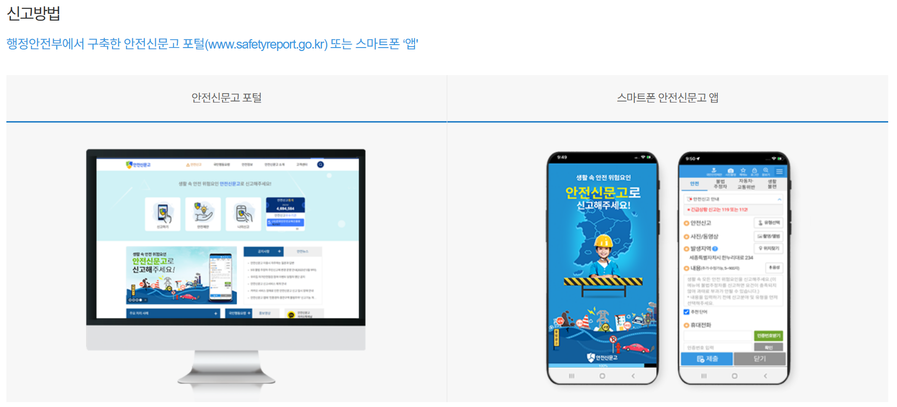 이 중 가장 간편하고 활용도가 높은 것은 행정안전부에서 제공하는 안전신문고 앱 입니다.