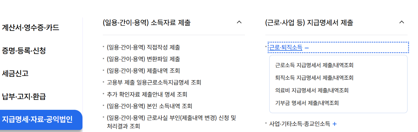 [마이홈택스] → [연말정산/지급명세서 내역조회] → [소득자료조회]