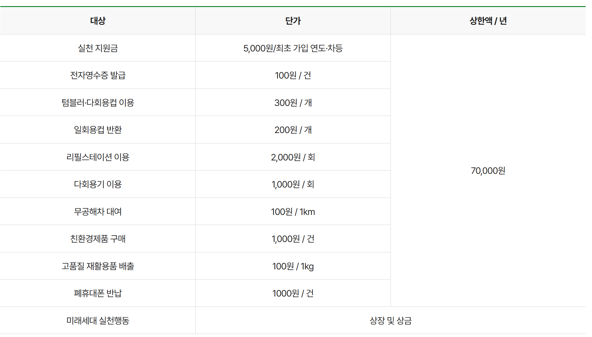 | 녹색생활 | 전자영수증 등 10개 항목 | 횟수/량 | 현금·카드포인트 | 최대 7만 원 |