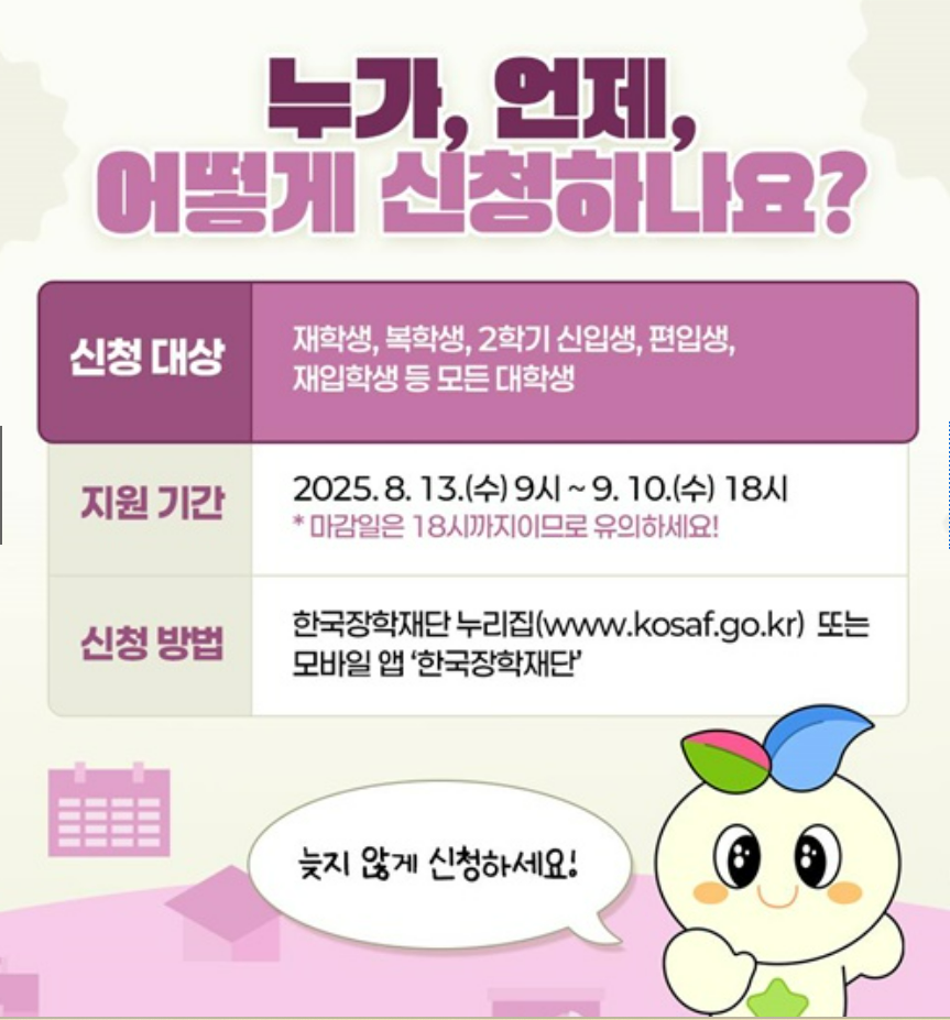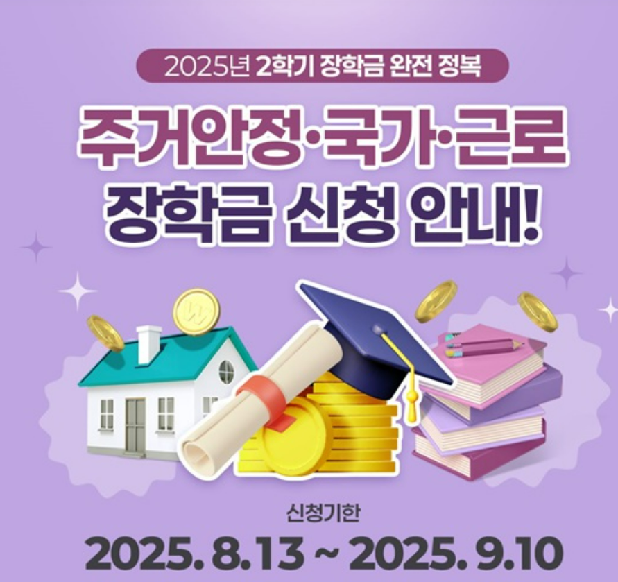 2025학년도 2학기 국가장학금 2차 신청은 8월 13일부터 9월 10일까지 진행되며, 서류 제출과 가구원 동의는 9월 17일까지 마쳐야 합니다. 대상은 신입생, 복학생, 편입생, 재입학생, 그리고 1차 신청을 놓친 재학생까지 모두 포함됩니다.