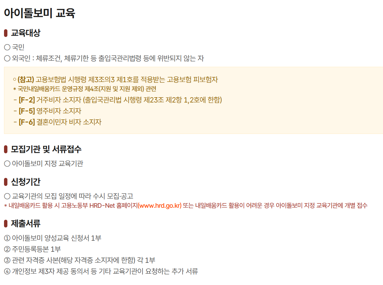 - 교육비·지원: 일부 과정은 국민내일배움카드(국가 직업훈련바우처)로 수강 가능하거나 지자체 지원을 받을 수 있으니, 비용 부담을 줄일 수 있는지 확인하세요.