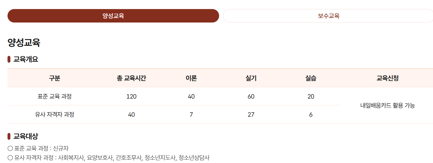 - 양성교육은 ‘표준 교육과정’을 따르며, 이론(안전관리·발달단계별 돌봄·응급처치 등)과 현장 실습을 포함.