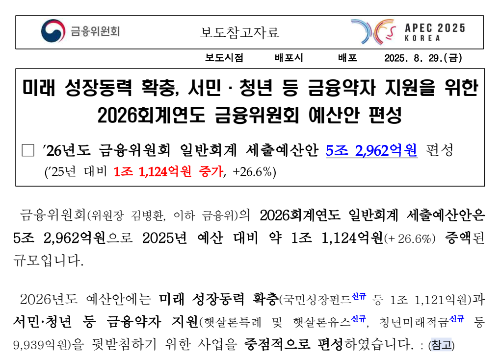 - 기타 공공기관 정책 예산안 자료 및 금융위원회 관련 보도