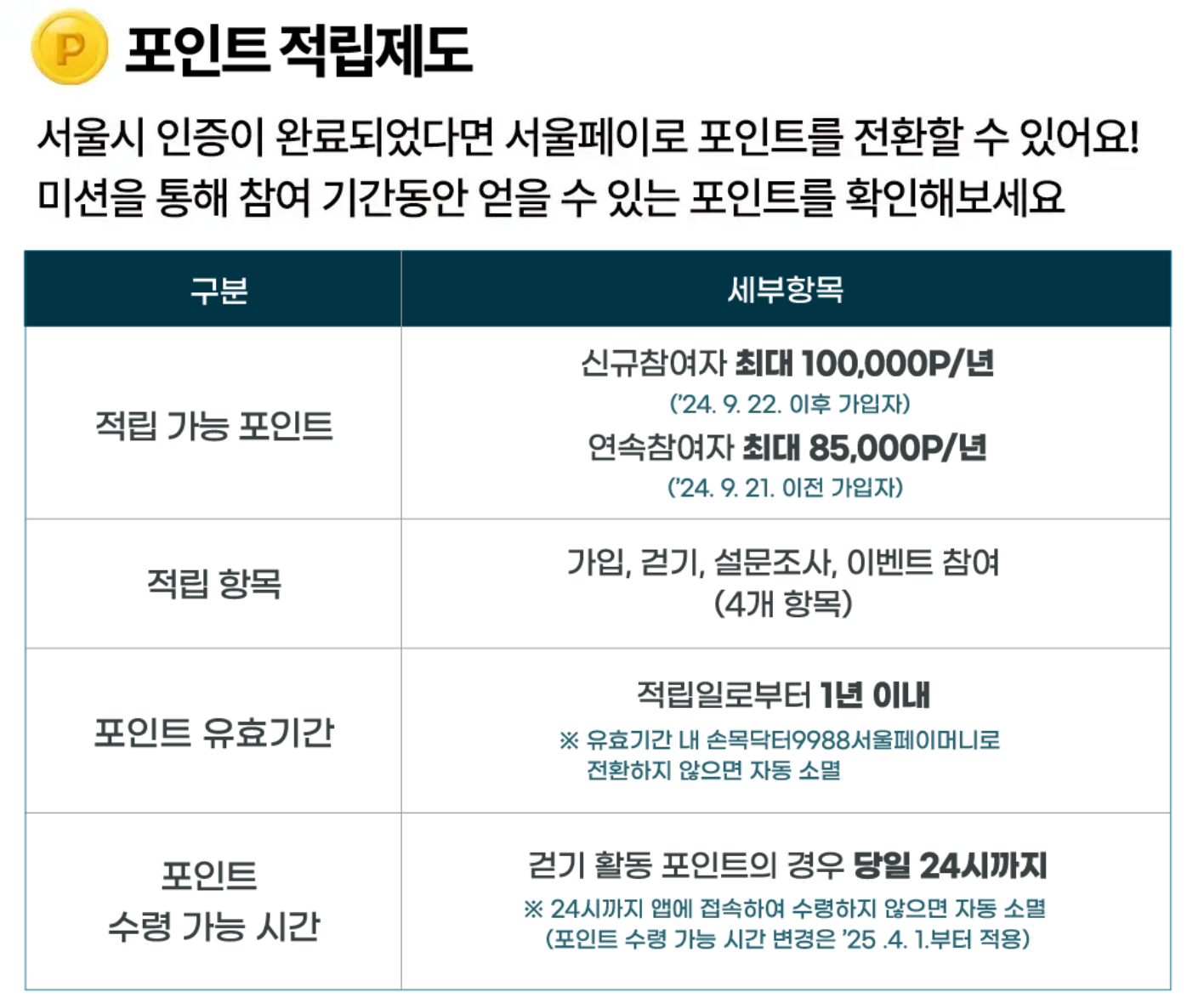 - 누적 포인트는 일정 기준 충족 시 서울페이머니로 전환