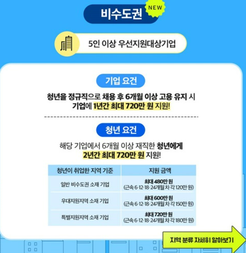비수도권 지역에서 취업한 청년의 경우에는 추가적인 혜택이 주어집니다. 수도권에 비해 취업 기회가 상대적으로 적은 지역 청년을 배려하기 위한 것으로, 같은 조건이라도 비수도권 취업자는 더 많은 지원을 받을 수 있는 구조입니다.