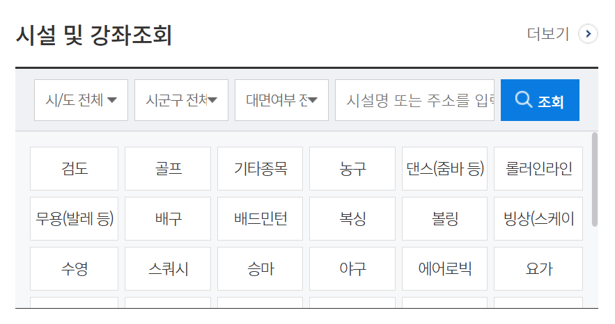 - [스포츠강좌이용권 홈페이지] 또는 지자체 홈페이지를 통해 수강 가능한 체육시설 확인